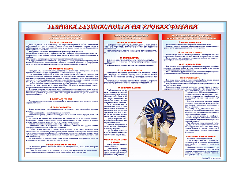 Стенд-уголок предназначен для наглядного отображения информации о технике безопасности при работе в кабинете физики.