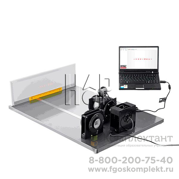 Стойка источника света истойка дляустановки дифракционной решетки жестко закреплены наосновании установки. Наповерхности основания имеется линейка дляизмерения расстояния отэкрана додифракционной решетки, используемой вопыте. Натойже поверхности смонтирована дополнительная стойка дляхранения двух дифракционных решеток, неиспользуемых вданный момент. Поляризатор установлен переддифракционной решеткой ииспользуется дляуменьшения интенсивности падающего наэкран излучения прифотографировании его спомощью видеорегистратора. Масштаб съемки определяется спомощью линейки, смонтированной внижней части экрана.