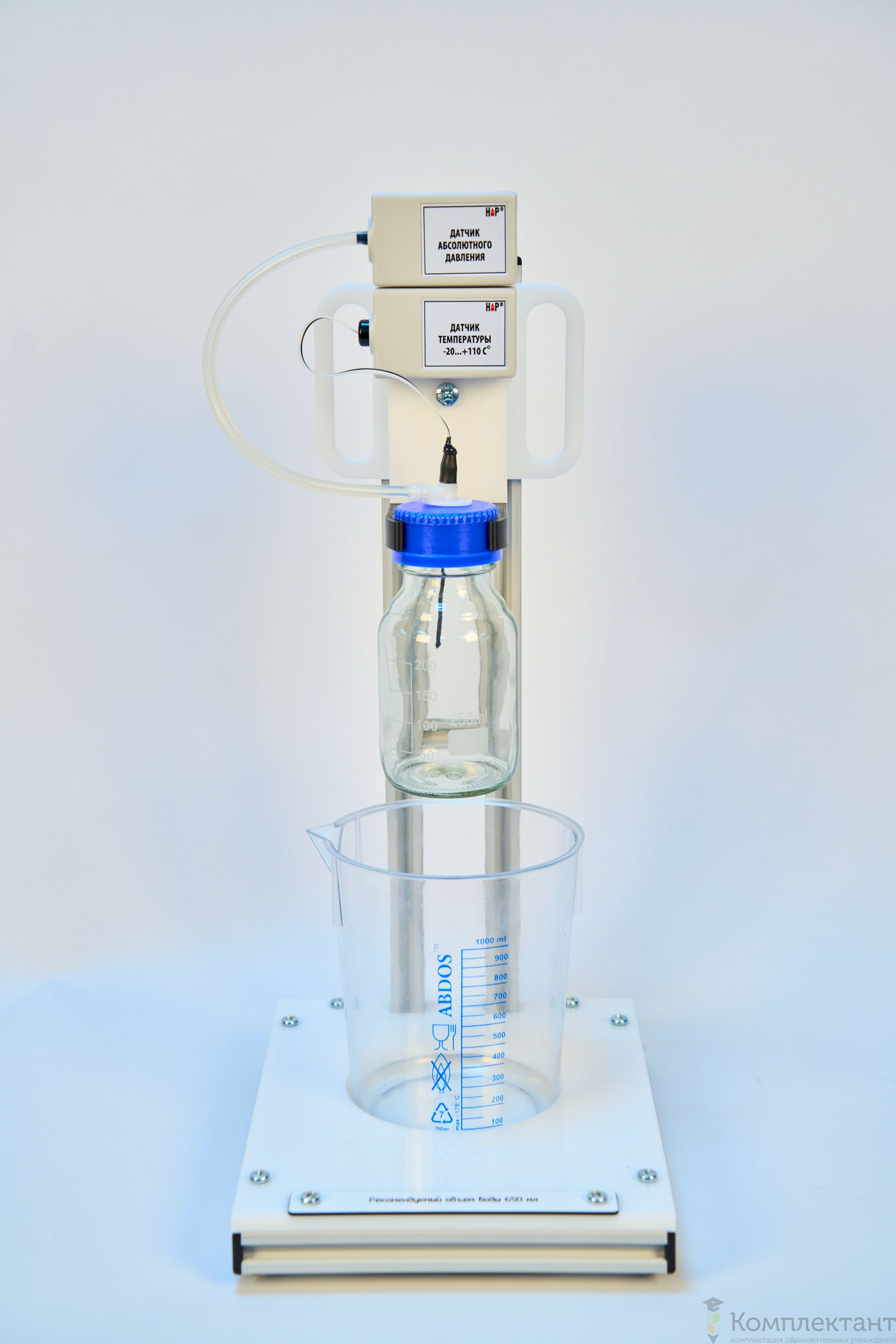 Лабораторная установка представляет собой герметичный стеклянный резервуар для газа, который смонтирован на вертикальной стойке таким образом, чтобы он мог быть погружен в стакан с горячей водой. Давление в нем измеряется цифровым датчиком абсолютного давления, который устанавливается над резервуаром и соединяется с ним гибкой трубкой.