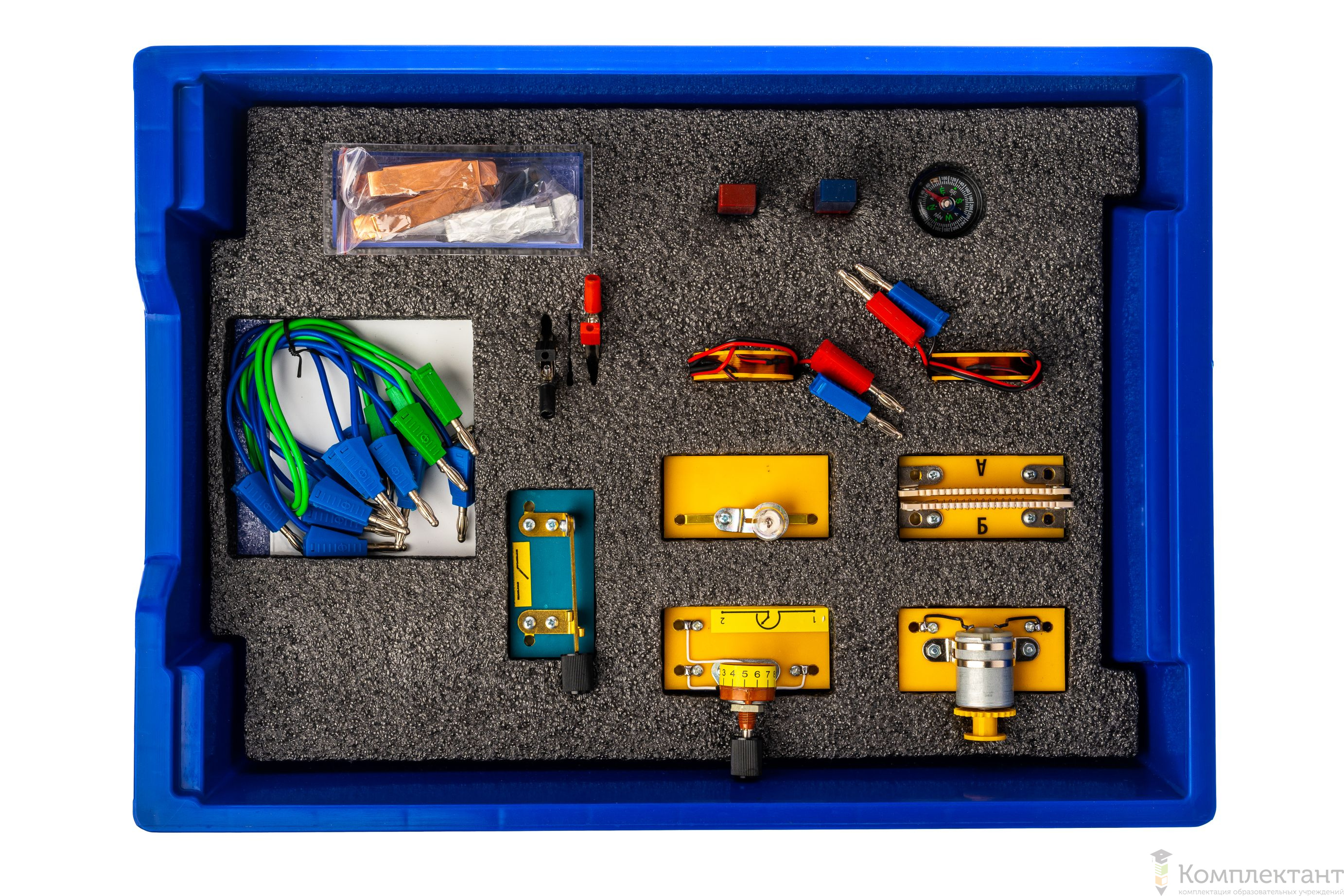 Состав набора оптимизирован таким образом, чтобы при проведении экспериментов можно было задействовать общее оборудование кабинета физики, такое как штатив с крепежными элементами, источник питания постоянного тока, вольтметр и амперметр, без дублирований.