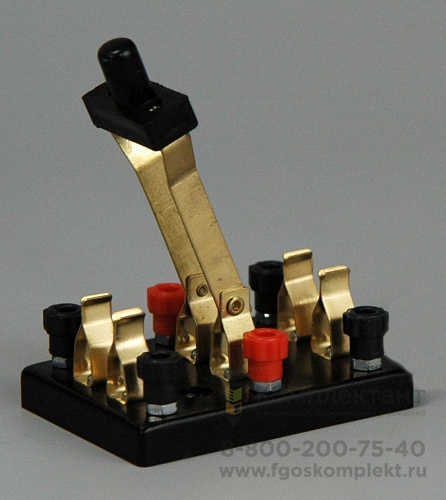 Переключатель представляет собой пластмассовое основание, на котором установлены две пары поворотных ножей с рукояткой, четыре упругие губки и шесть универсальных зажимов. Имеет три положения. Среднее – нейтральное. Допустимое напряжение – не более 24В с током нагрузки до 2А.
