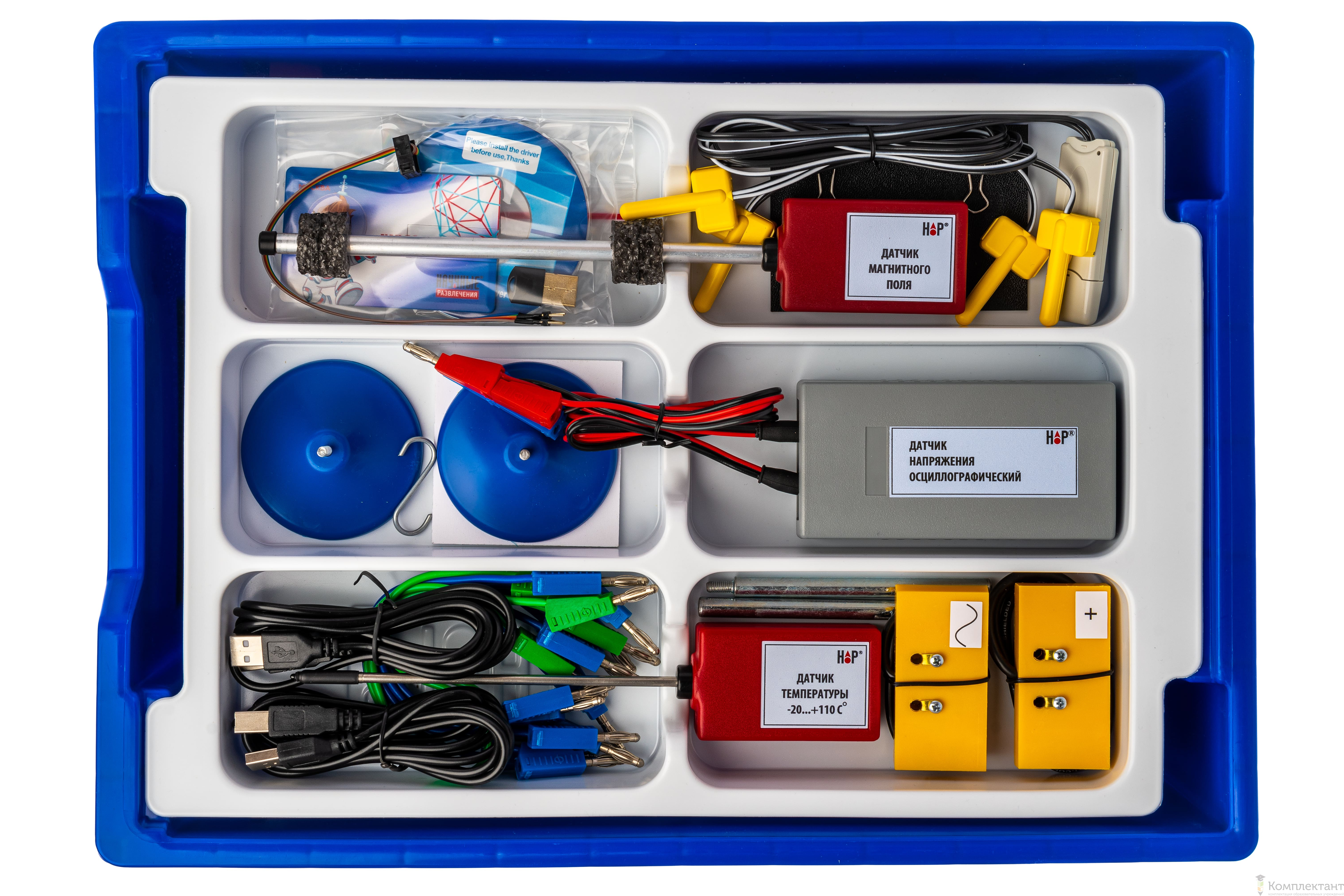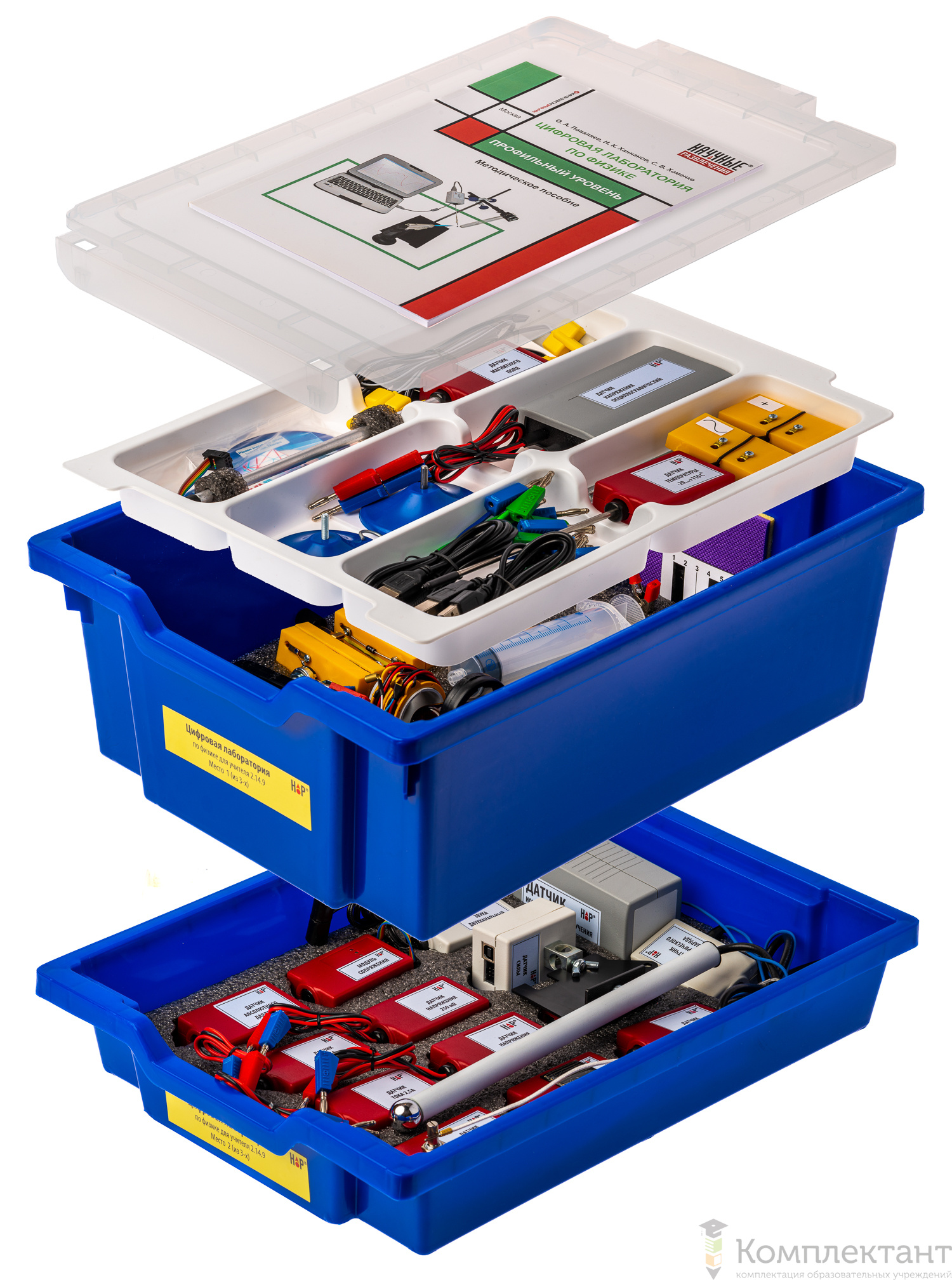 Все оборудование цифровой лаборатории (кроме скамьи) укомплектовано в специальные пластиковые контейнеры, которые закрываются прозрачной пластиковой крышкой. Комплект оборудования и датчики в контейнерах располагаются на ложементах в индивидуальных ячейках. Скамья имеет отдельную упаковку
