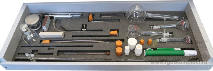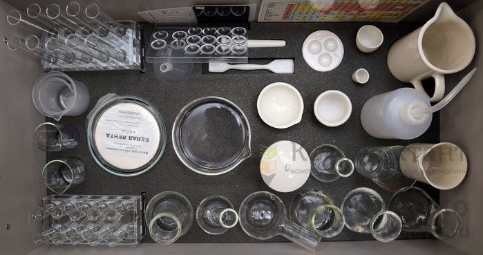 Комплекс включает более 120 наименований лабораторного оборудования, приборов, наборов, приспособлений, узлов и деталей, а также стеклянную, полимерную и керамическую посуду, инструменты и принадлежности, в том числе: ноутбук, цифровую лабораторию, цифровой микроскоп, электронные весы и термометр, источники электропитания, электронагреватель пробирок, приборы и оборудование для получения газов, мерную посуду, калориметр, магнитную мешалку, набор по электрохимии, штативы с приспособлениями из нержавеющей стали и др.