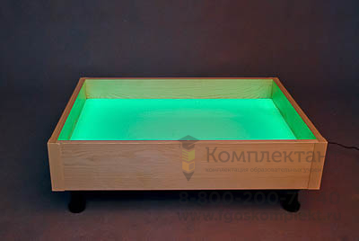 Экологически чистый настольный световой модуль изготовлен из бука. Наличие съемных регулируемых опор позволяет использовать модуль как на столе, так и на полу. Подсветка через молочное акриловое дно модуля делает работу с набором интересной и увлекательной. На боковой стенке имеются кнопки трех цветов (красного, синего, зеленого). Нажатие трех кнопок одновременно дает белый цвет подсветки; сочетание красной и синей – сиреневый цвет, красной и зеленой – желтый, зеленой и синей – голубой. Цветовые возможности модуля позволяют использовать его в процессе реализации различных видов деятельности детей.