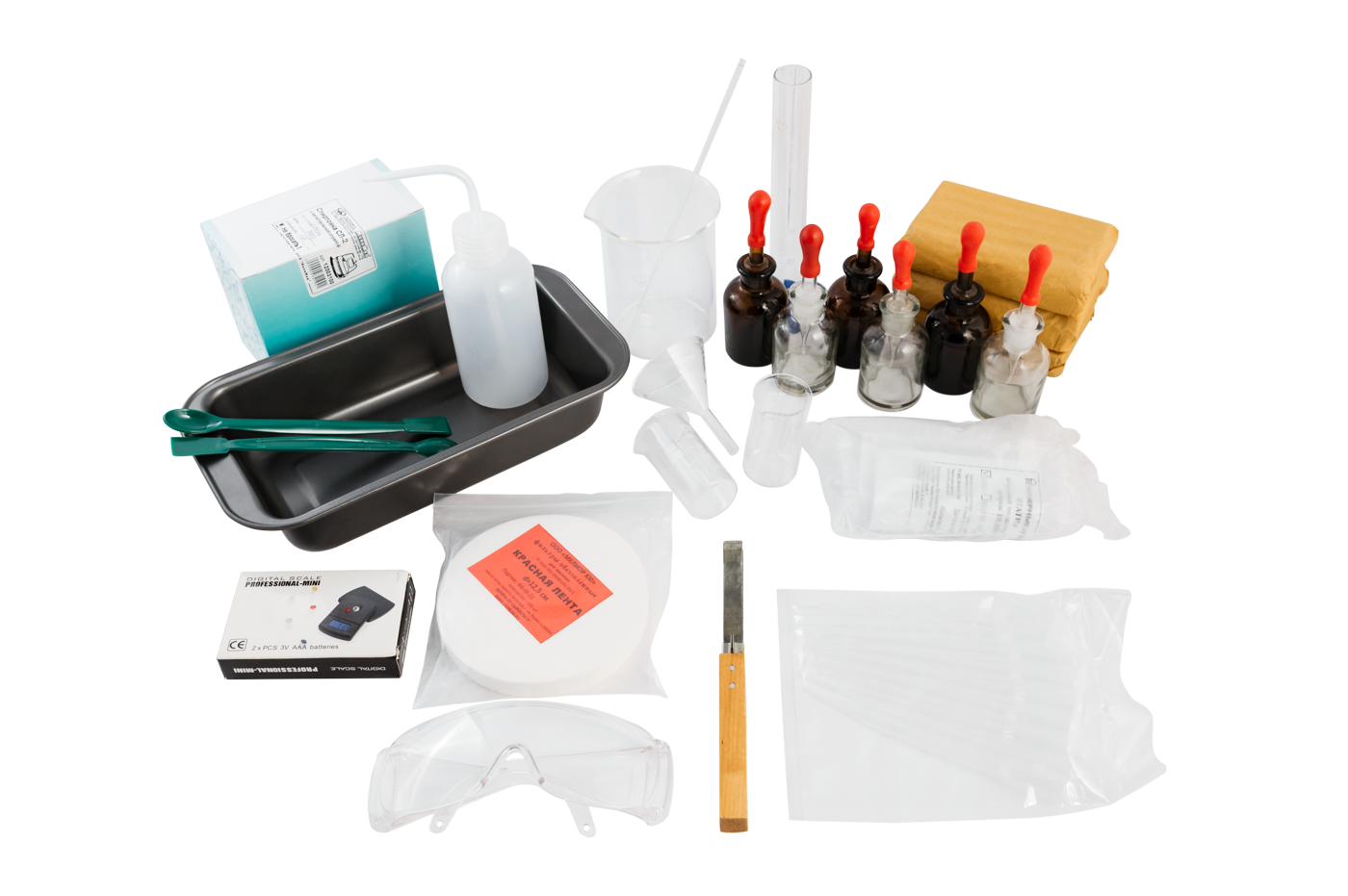 Набор лабораторной посуды и приспособлений включает в себя спиртовку, весы до 200 г, одноразовые халаты и перчатки на группу из 15 учащихся. Также в набор включены пипетки Пастера 3 мл для отбора жидкостей и промывалка 250 мл для дистиллированной воды. Соостав полностью соответствует требованиям ФИПИ.