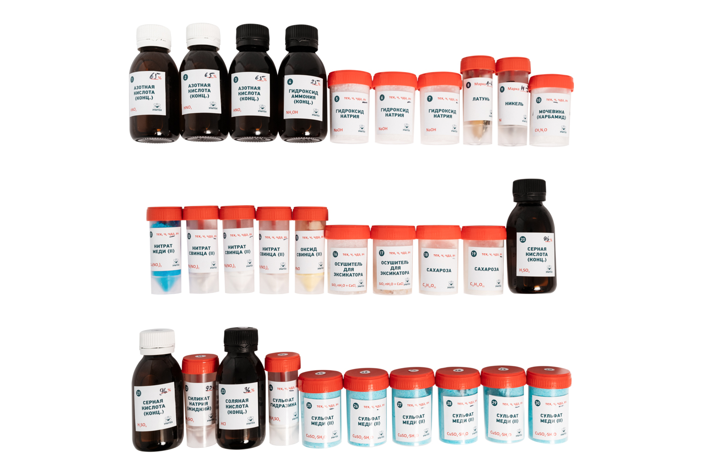 На каждой емкости с реактивом указано его название, формула, концентрация,порядковый номер (в т.ч. на крышке).