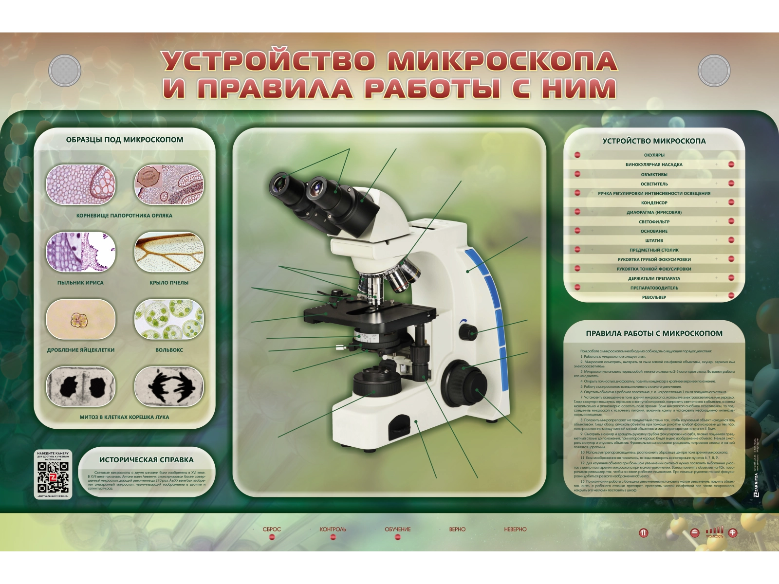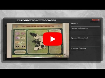 Электрифицированный стенд предназначен для изучения конструкции и правил работы с микроскопом, а также проведения интерактивного тестирования по данной теме на уроках биологии (естественно-научных предметов).