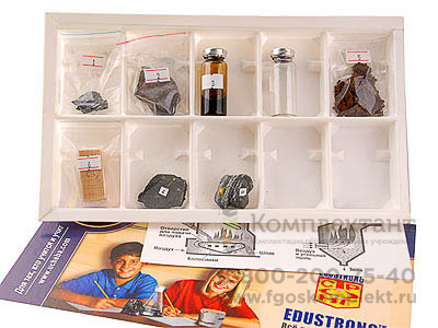 Образцы пронумерованы согласно списку и упакованы в коробку с ячейками. Пособие комплектуется руководством по эксплуатации и ламинированным вкладышем с иллюстрациями различных способов сжигания топлива.