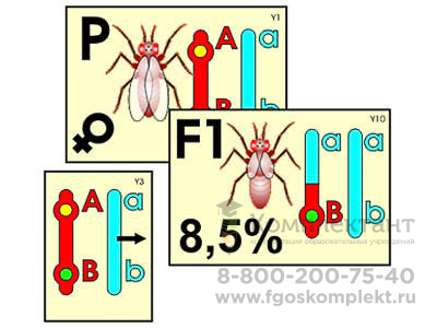Пособие включает 10 ламинированных карточек с магнитными креплениями, из которых на магнитной доске или экране для динамических пособий монтируется схема перекреста хромосом. Для удобства использования в верхнем правом углу карточки нанесена маркировка (Y1, Y2… Y10).