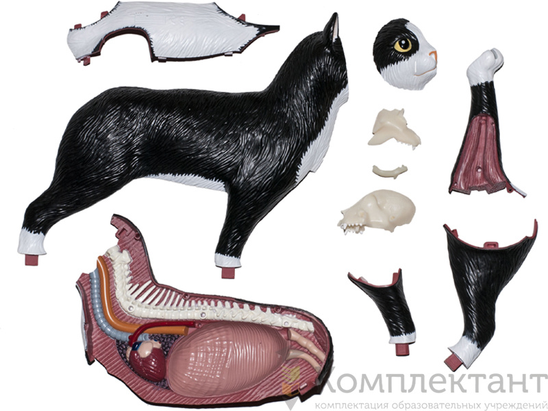 Модель отличается высокой детализацией и научной точностью. Она состоит из 28 частей, которые включают как внешние особенности черно-белого кота, так и его внутренние органы. Некоторые части модели выполнены из прозрачного пластика, что позволяет видеть внутреннее строение организма. Органы являются съемными, что дает возможность изучать их по отдельности и понимать их взаимное расположение. Все детали тщательно проработаны и вручную раскрашены для достижения максимальной реалистичности.