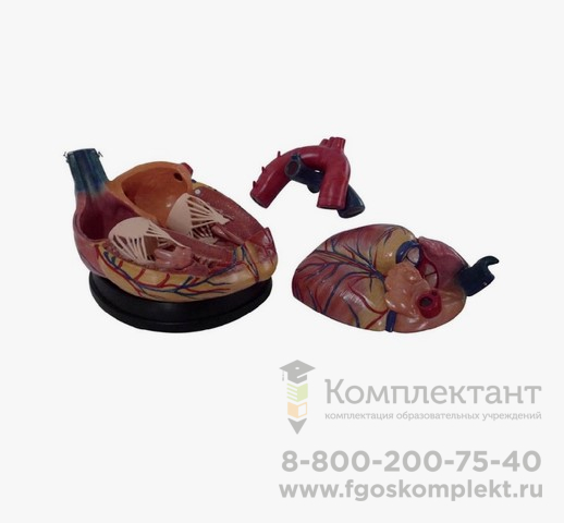 Демонстрационное учебное пособие - анатомическая модель сердца человека, увеличенная в 4 раза. Разбирается на 3 части. На подставке. Материал - пластик.