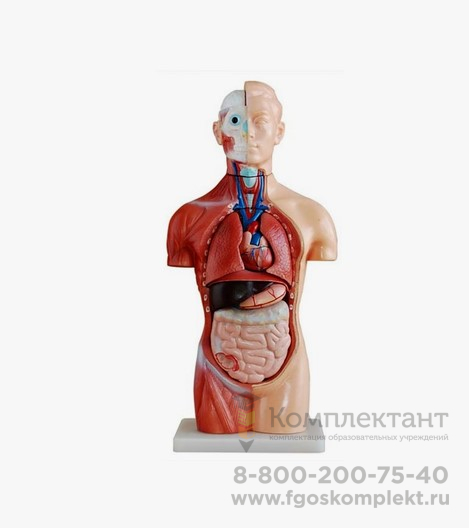 Анатомическая модель торса человека отображает строение и взаимное расположение внутренних органов в организме человека. Модель объемная, разборная на 18 частей: туловище, голова, головной мозг, трахея, пищевод и нисходящая аорта, диафрагма, легкие (4 части), сердце (2 части), желудок, печень, почки, поджелудочная железа и селезенка, кишечник, позвонки.
