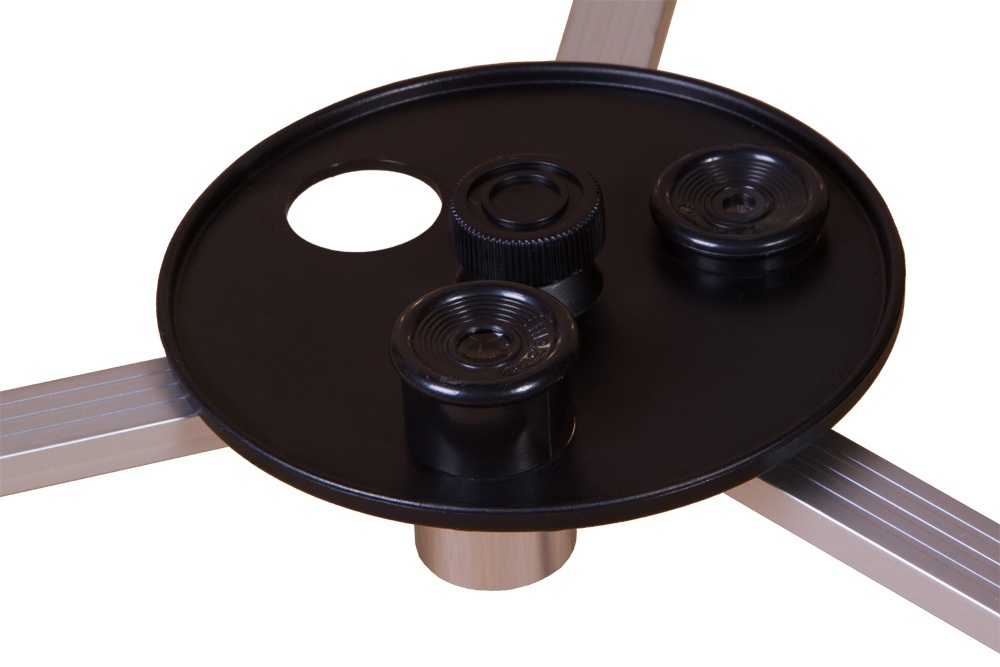 Телескоп устанавливается на легкую алюминиевую треногу. Высоту ее ножек можно регулировать, что позволяет быстро подстроить телескоп под рост наблюдателя. На треноге фиксируется лоток для аксессуаров, на нем можно разместить дополнительные окуляры, карты звездного неба, компас и любые мелкие предметы.