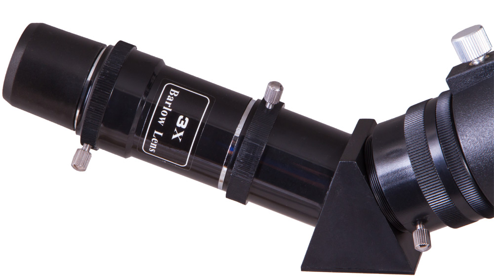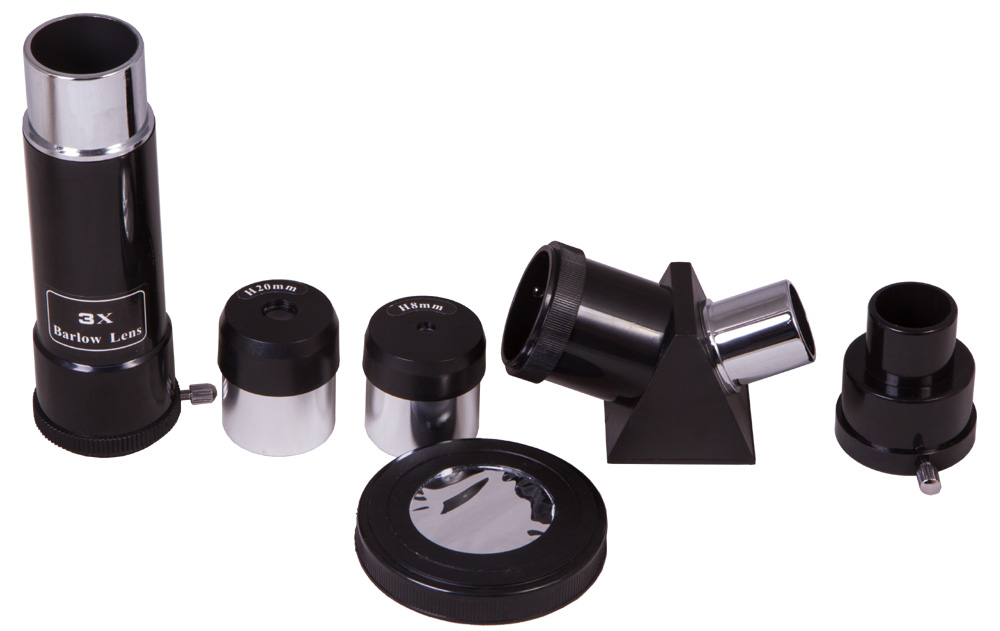 Линзы с многослойным просветляющим покрытием обеспечивают высокое качество изображения. В комплекте идут два окуляра увеличением 45 и 18 крат с посадочным диаметром 1,25". 3-кратная линза Барлоу (в комплекте) со штатными окулярами позволяет получить увеличение 135x. Максимальное полезное увеличение телескопа составляет 100x.