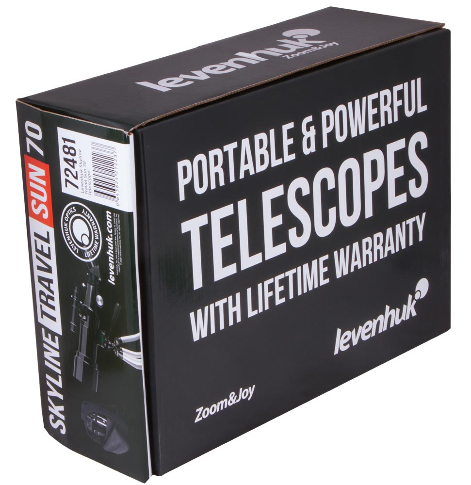 Телескоп Levenhuk Skyline Travel Sun 70 – легкий и простой в управлении рефрактор с хорошими оптическими возможностями. Лучше всего он проявит себя вдали от городской засветки. Телескоп отлично подойдет для наблюдения планет Солнечной системы и поверхности Луны. При минимальной засветке и хороших погодных условиях можно рассмотреть объекты каталога Мессье без детализации, лунные кратеры диаметром до 8 км, звезды до 11,5 звездной величины. Штатная диагональная призма строит прямое (неперевернутое) изображение, поэтому в телескоп удобно рассматривать и наземные объекты.
