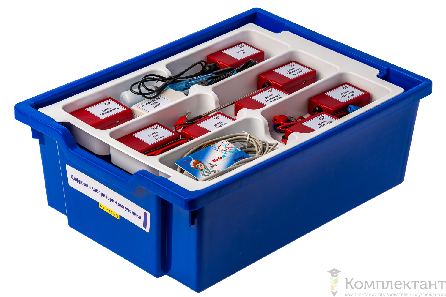 Все оборудование цифровой лаборатории укомплектовано в пластиковую систему хранения, которая закрывается прозрачной пластиковой крышкой на защелках для обеспечения наблюдения за содержимым. Комплект оборудования и датчики в системе хранения располагаются на ложементах в индивидуальных ячейках.
