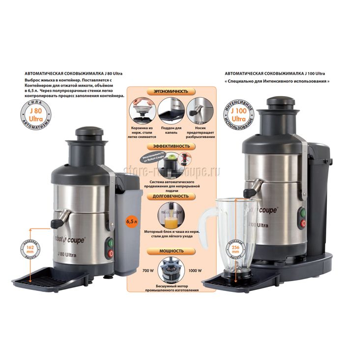 Данная модель соковыжималки – необходимое оборудование для любой кухни, но особенно для системы детского питания. Хотя и для использования на дому ее покупают с удовольствием, особенно, если габариты кухонного помещения позволяют выделить небольшую площадь для этого устройства. Универсальная конструкция одинаково успешно перерабатывает овощи, фрукты и цитрусовые как для использования в свежем виде, так и для консервации. Сочетание высокой скорости приготовления соков фреш, простоты ухода и низкого энергопотребления делает соковыжималку Robot Coupe J80 Ultra одной из самых популярных моделей кухонного оснащения.