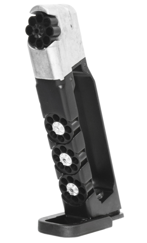 Боеприпасы для этого пистолета - это стандартные шарики ВВ или свинцовые пули 4,5 мм. Магазин вмещает 32 заряда (4 барабана по 8). Здесь реализована функция Blowback, имитирующая отдачу боевого изделия.