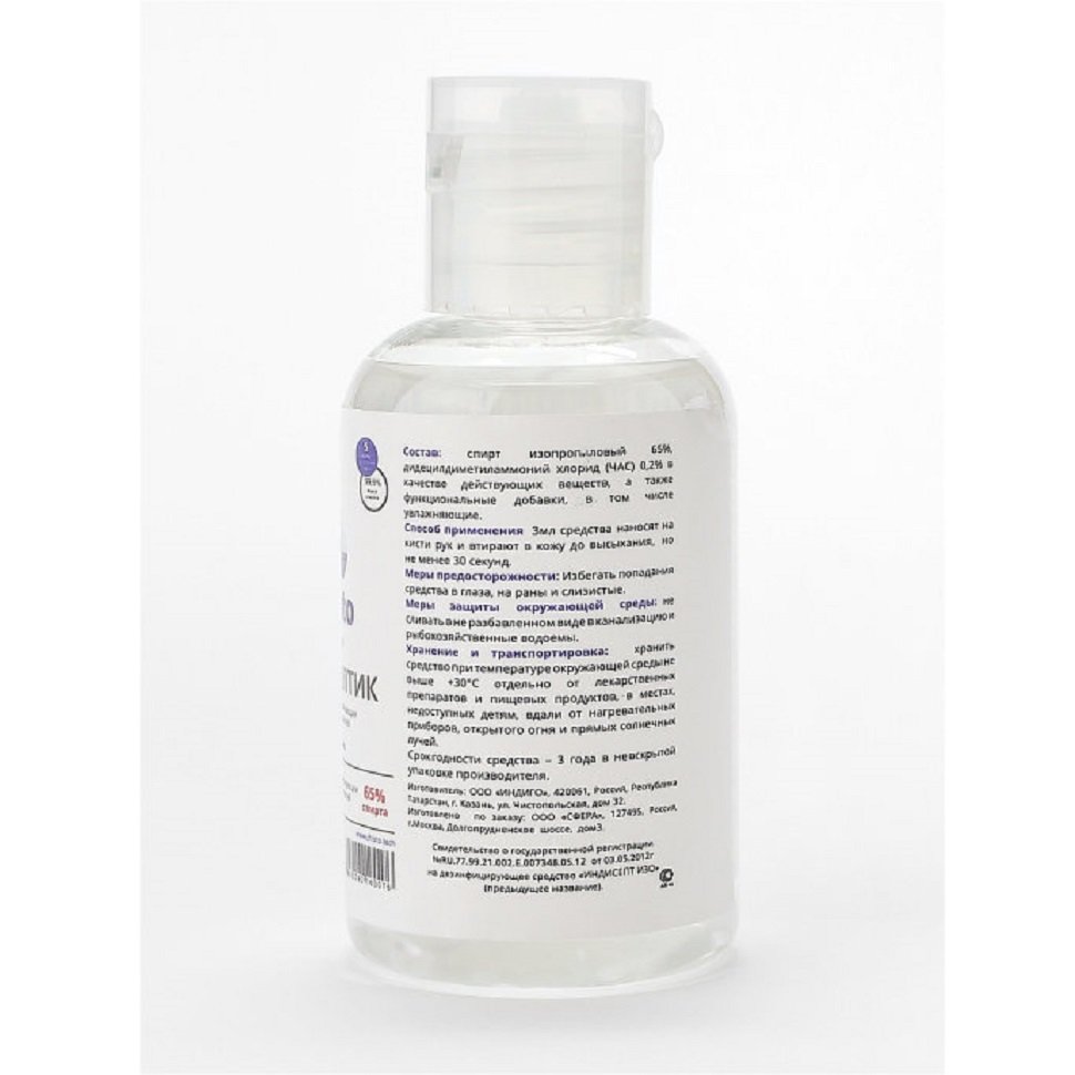 Средство содержит спирт изопропиловый 65%, что соответствует рекомендациям Роспотребнадзора о выборе антисептика для рук и дидецилдиметиламмоний хлорид (ЧАС) 0,2% в качестве действующих веществ, а также функциональные добавки, в том числе увлажняющие.