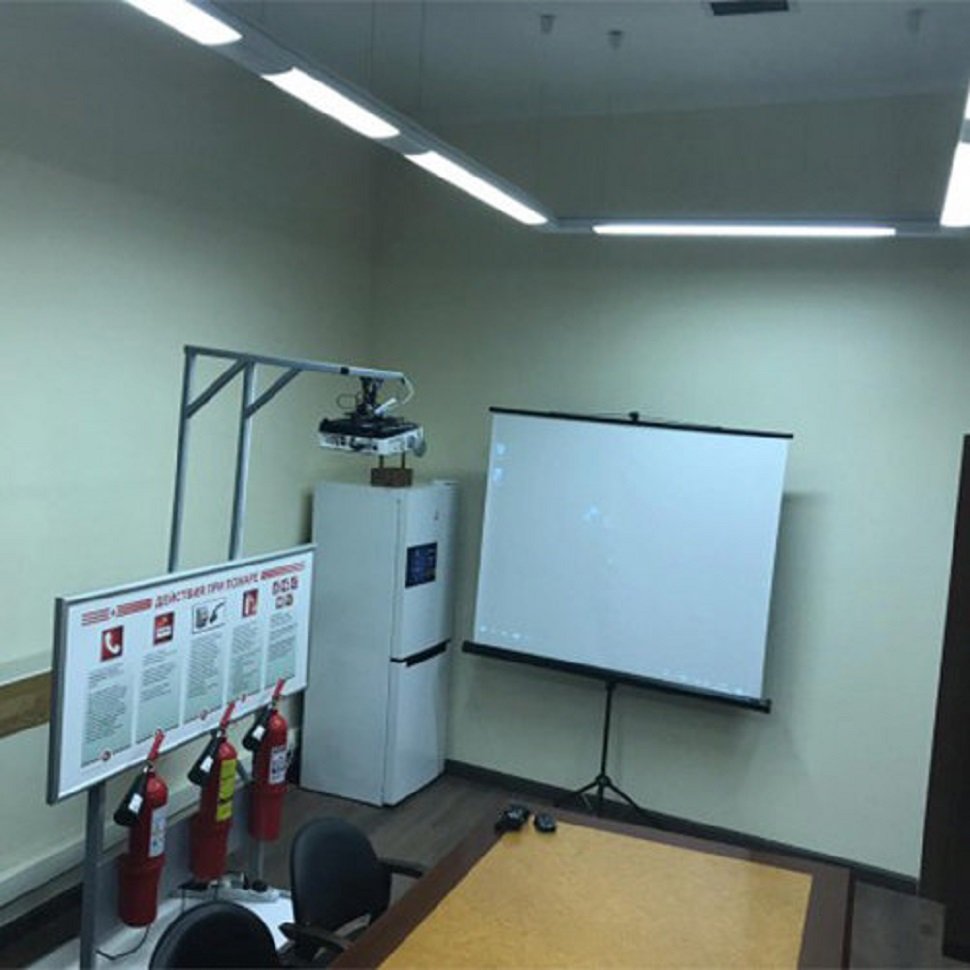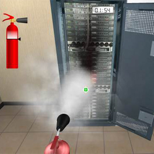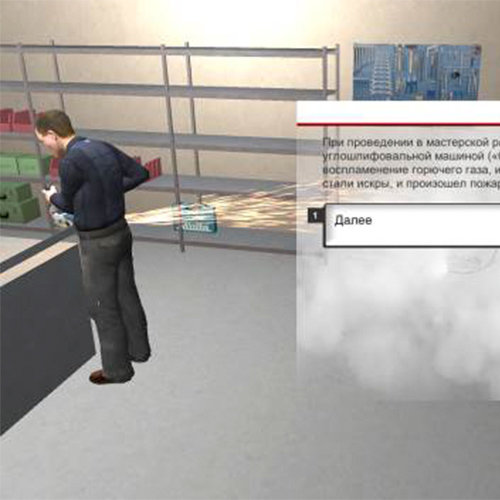 Программное обеспечение интерактивного тренажерного комплекса содержит пять сценариев пожара в зависимости от вида горючего материала, обеспечивает трехмерное изображение помещения и расположенных в нем объектов, очага пожара, задымления, огнетушащей струи, изменения площади пожара и задымления в зависимости от действий обучаемого при тушении очага возгорания.