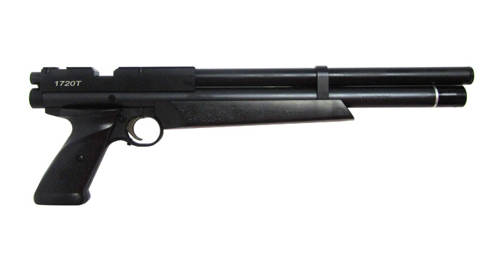 При заводских испытаниях 1720Т показал на пулях весом 7,9 гран скорость 218-219 м/сек, причем с одной закачки можно выстрелить 30 раз. Если взять пулю с массой 10,5 гран, то скорость станет 192-195 м/сек с тем же количеством выстрелов на одну подкачку.