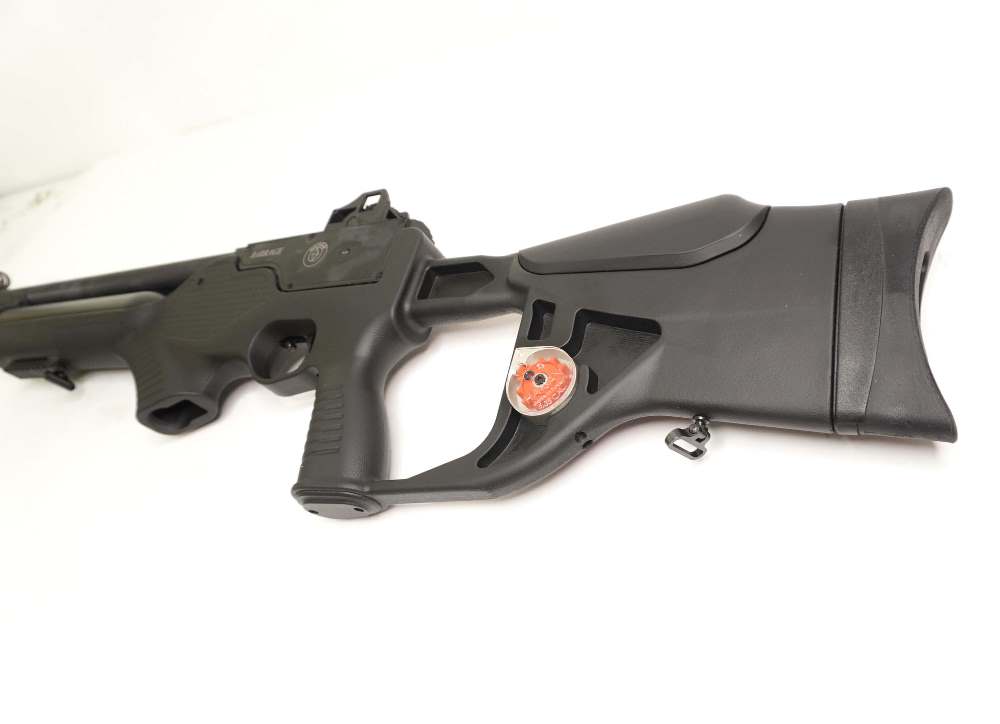 Здесь реализована уникальная система для предотвращения потерь воздуха при ударе оружия об землю или другую твердую поверхность. Установлен манометр, контролирующий давление в резервуаре. Для стрельбы используются пули 5,5 мм, клип-барабан вмещает 12 снарядов.