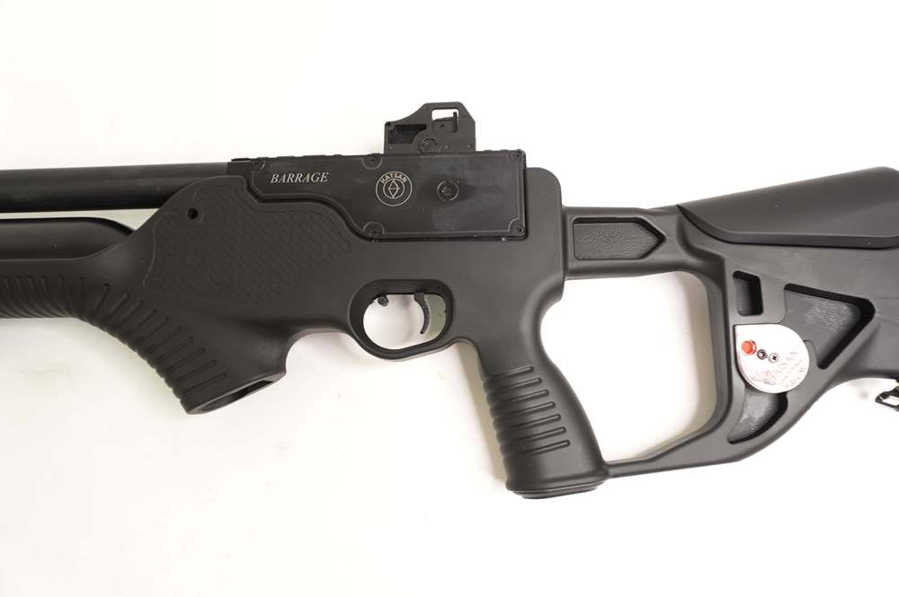Для ствола и ответственных внутренних элементов Hatsan Barrage использовалась сталь, приклад и ложе модели полимерные. Рукоять пистолетного типа и цевье имеют насечки для комфорта хвата. Приклад винтовки тактический, щека регулируется под анатомические особенности каждого стрелка. Резиновый затыльник на прикладе амортизирует отдачу.