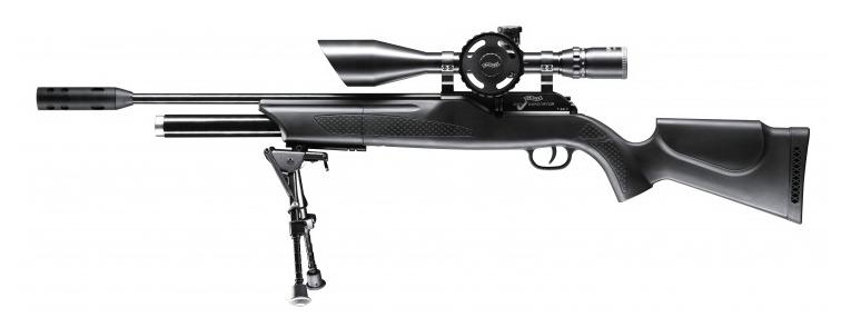 В комплекте с винтовкой поставляются дульная насадка(компенсатор), оптический прицел Walther 8-32х56, сошки, пластиковый кейс, редуктор и конверсионный набор на 28 Дж.