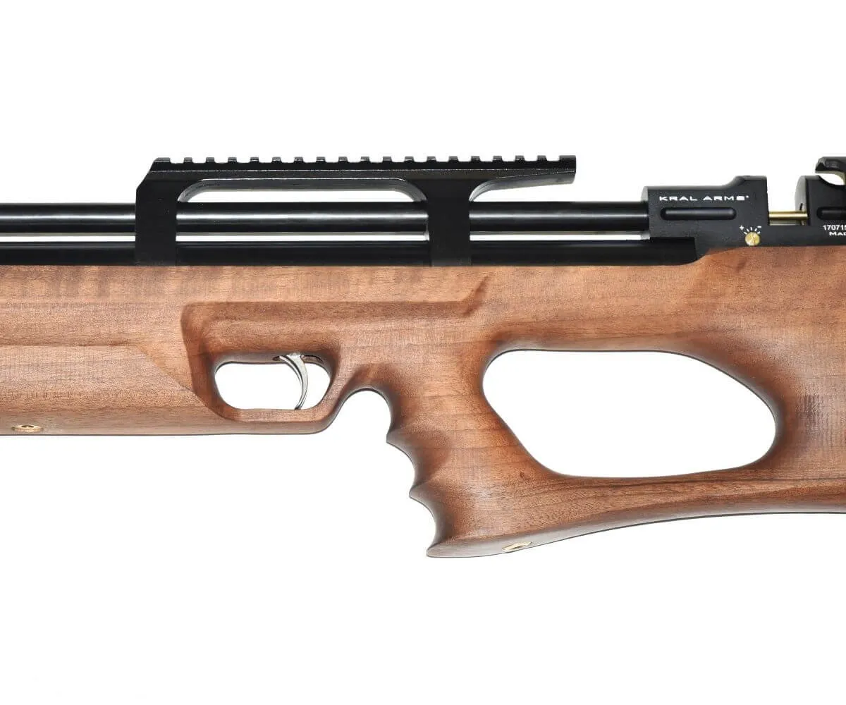 Все детали корпуса, такие как ложе, приклад и пистолетная рукоять изготовлены из качественного дерева. Это придает винтовке очень красивый и действительно элитный вид. Кроме того, дерево требует определенного ухода и поэтому Kral Puncher Breaker 3W подойдет именно серьезно увлекающимся оружием владельцам.