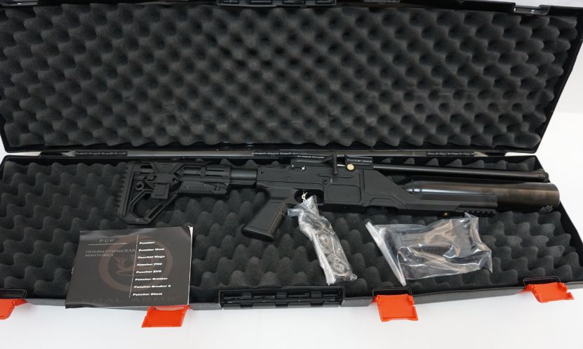 В комплекте: магазин-барабан - 2 шт, заправочный штуцер, перепускной клапан, тактические сошки-рукоять, паспорт (инструкция), пластиковый кейс