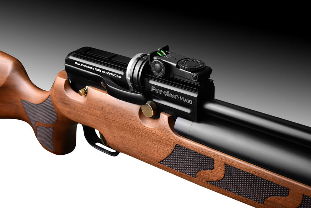 Как и многие другие пневмовинтовки ПСП Крал Панчер Макси 3 Вуд снабжен предохранителем, выполненным виде флажка с двумя рабочими позициями (переднее положение - боевое, заднее - безопасное). Прицел выходит на правую сторону винтовки.