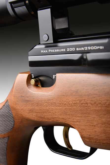 Для отслеживание оставшегося воздуха в винтовке имеется встроенный манометр, он находится на нижней части ложе. Максимальное давление в винтовке 200 Бар, хотя манометр позволяет замерять давления до 300 Атм.