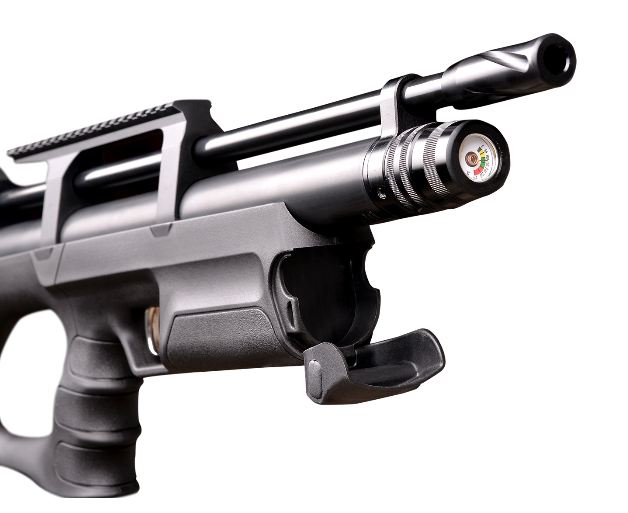 На резервуаре винтовки Kral Puncher Breaker 3 установлен манометр с максимальным давлением в 300 Бар. Ствол у винтовки нарезной, на конце ствола имеется небольшой надульник, прикрывающий резьбу для накручивания саундмодератора. Приклад выполнен из прочного полимера, имеет форму булл-пап благодаря чему длина всей винтовки всего 735 мм, а вес Kral Puncher Breaker 3 - 3.4 кг.