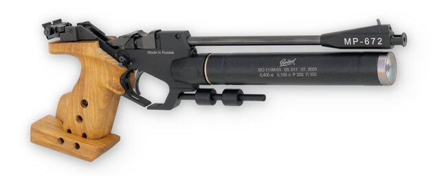 Пневматический пистолет МР-672 разработан на базе известного стандартного пневматического пистолета ИЖ-46. Пневмобаллонная схема обеспечивает большее удобство при стрельбе, чем компрессионная, не снижая характеристик кучности. Спусковой механизм у данной модели с регулировкой положения спускового крючка, хода и усилия спуска. Система "тренировочного спуска" позволяет спортсмену отрабатывать стрельбу, не используя клапанное устройство, что продлевает срок службы оружия. Ортопедическая деревянная рукоятка с регулируемым упором кисти обеспечивает комфортность при стрельбе.