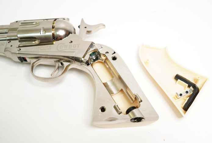 Углекислый баллончик СО2 устанавливается в рукоять револьвера, порсле снятия накладки с левой стороны.