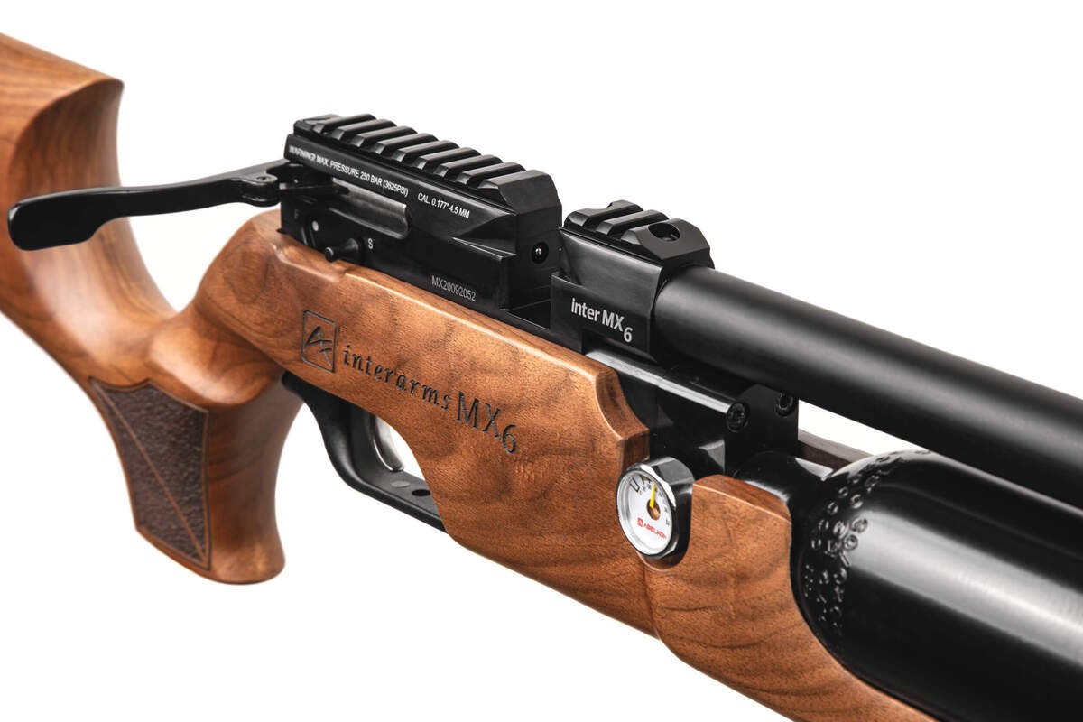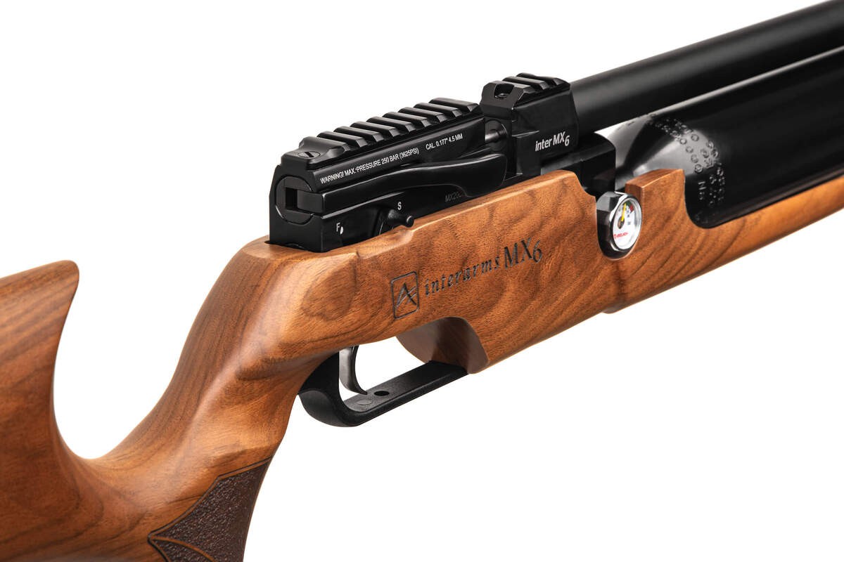 Aselkon MX 6 - пневматическая винтовка с предварительной накачкой PCP. Данная модель разработана под калибр 5,5 мм. Для контроля давления в газовом баллоне установлен манометр. Стационарный глушитель обеспечивает бесшумную стрельбу. Съемный магазин рассчитан на 12 зарядов. Начальная скорость пули 120 м/с, дульная энергия 3 Дж. Отсутствие мушки компенсировано наличием прицельной планки пикатинни для установки оптики. Приклад оружия выполнен из дерева. Его оригинальная эргономичная форма дарит невероятный комфорт во время стрельбы.