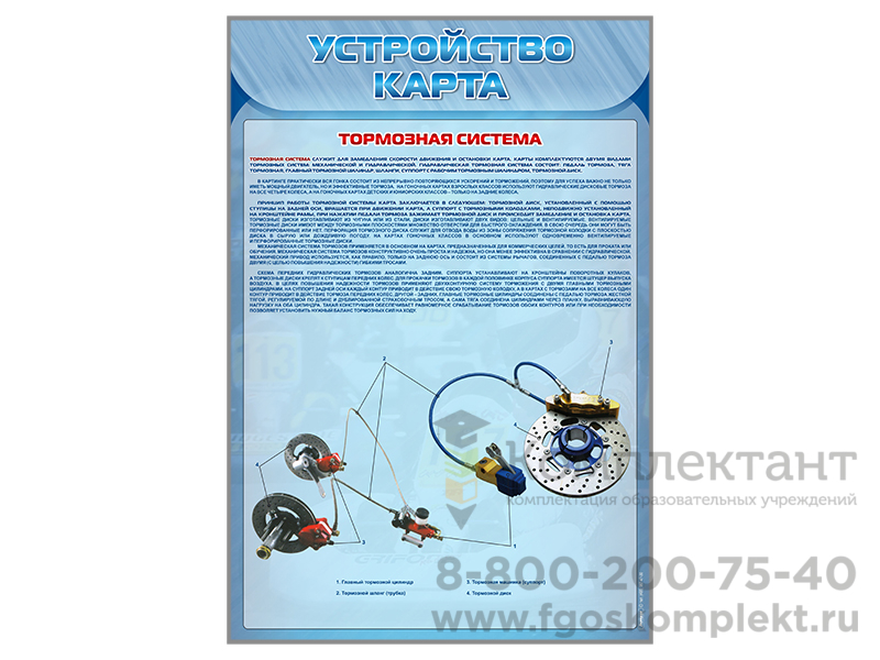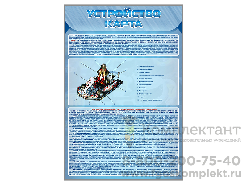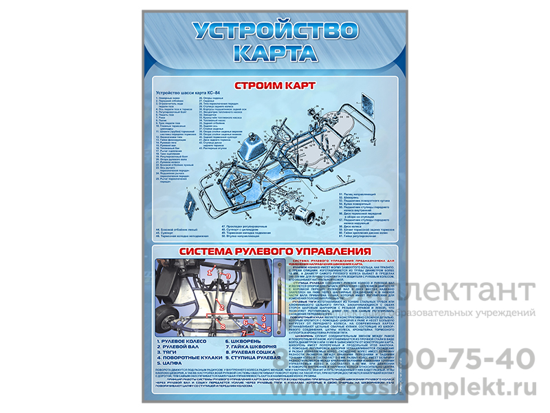Стенды предназначены для ознакомления обучающихся с двигателем с коробкой передач и без нее, шинами, шасси, системой рулевого управления, тормозной системой карта, а также для формирования осознанного отношения к занятиям картингом.