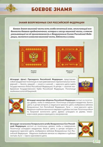 Стенд с информацией о боевых знаменах и штандартах. Предназначен для размещения в кабинете ОБЗР и военной подготовки в образовательном учреждении.