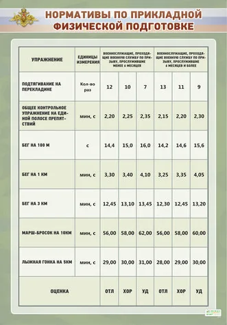 Стенд с информацией о нормативах по прикладной физической подготовке. Предназначен для размещения в кабинете ОБЗР и военной подготовки в образовательном учреждении.