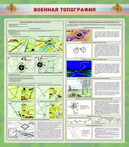Стенд с информацией о топографическом ориентировании на местности. Предназначен для размещения в кабинете ОБЗР и военной подготовки в образовательном учреждении.