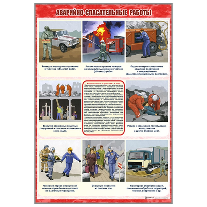 Стенд "Аварийно-спасательные работы" представляет собой панель, на которой размещена информация по аварийно-спасательным и другим неотложным работам.