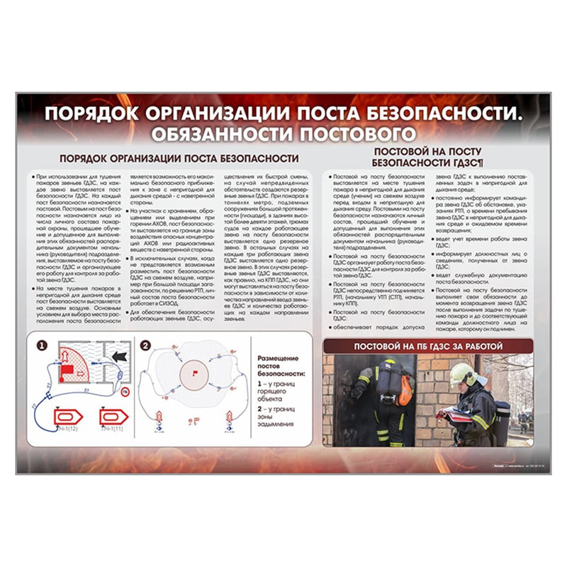 Стенд представляет собой информационную панель, содержащую сведения о порядке организации поста безопасности, обязанностях постового на посту безопасности ГДЗС, а также схему размещения постов безопасности.