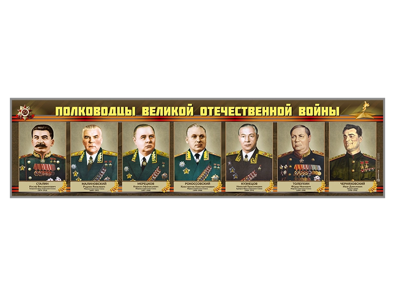Стенды представляют собой информационные панели, на которых изображены портреты талантливых полководцев Великой Отечественной войны, отважно и преданно служивших Родине, военные операции, проведенные которыми, изучают и сейчас в военных образовательных учреждениях по всему миру.