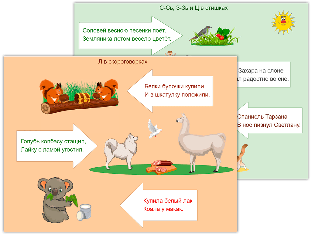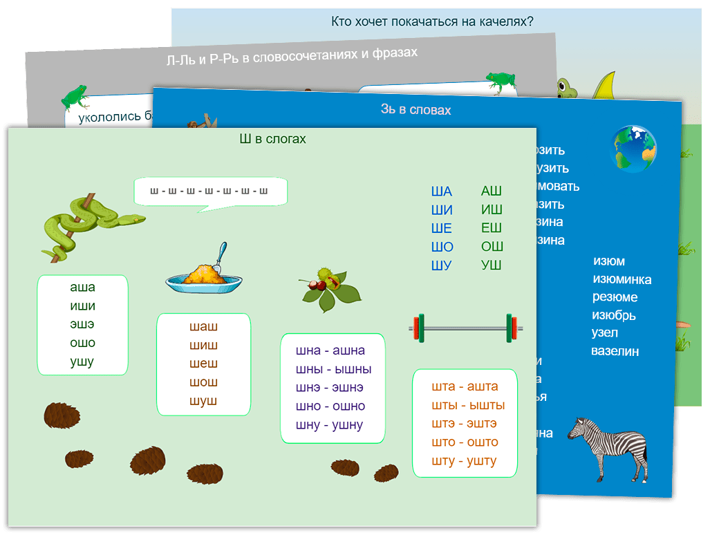 Мы продумали сортировку заданий, чтобы вы быстро находили нужный материал. Все слайды разбиты по буквам, а затем по этапу отработки: в слогах и словах, в словах и словосочетаниях, во фразах и связной речи.