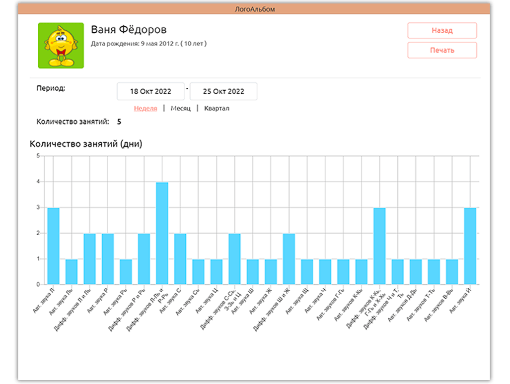 Когда вы занимаетесь в профиле ребенка, то по занятиям собирается статистика. Она поможет составить годовой отчет или провести наглядную презентацию результатов родителям ребенка.