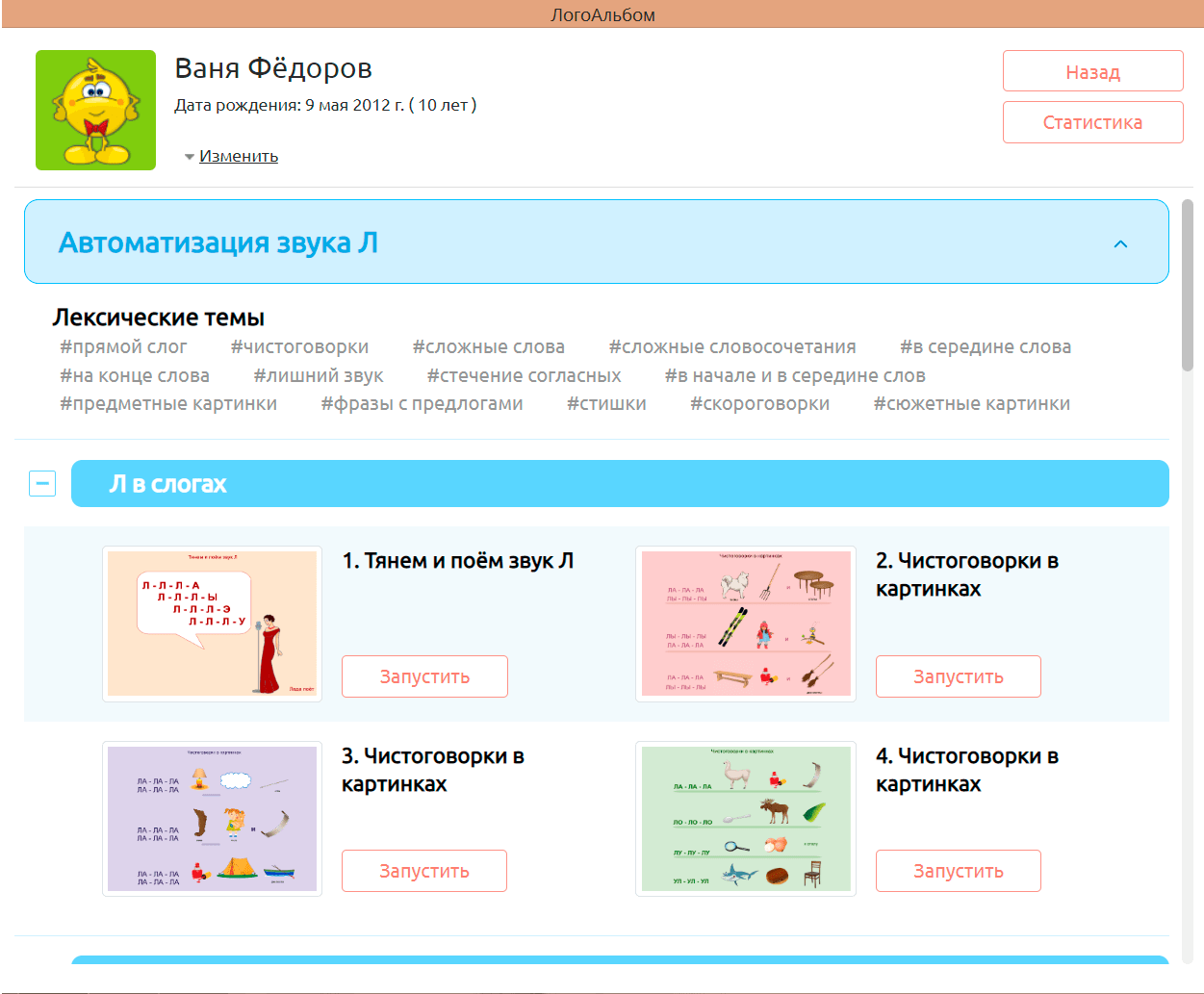 Программа состоит из дидактического материала и профилей детей, где сохраняются результаты занятий.