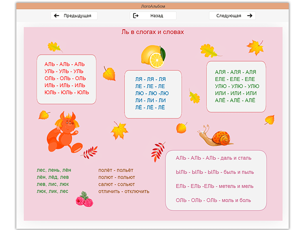На флешке 200 слайдов со словами и картинками. Логопедические слайды содержат материалы на отработку звукопроизношения. Они помогут ребенку многократно повторять слова в виде слоговых цепочек, слов, фраз, чистоговорок, скороговорок, стишков и других логопедических упражнений на работу с трудными звуками. В профиль ребенка можно записать его имя, фамилию, возраст, выбрать аватарку. В нем автоматически сохраняются данные по занятиям: когда занимались, сколько и над какими звуками работали. Комплект "ЛогоАльбом" содержит: