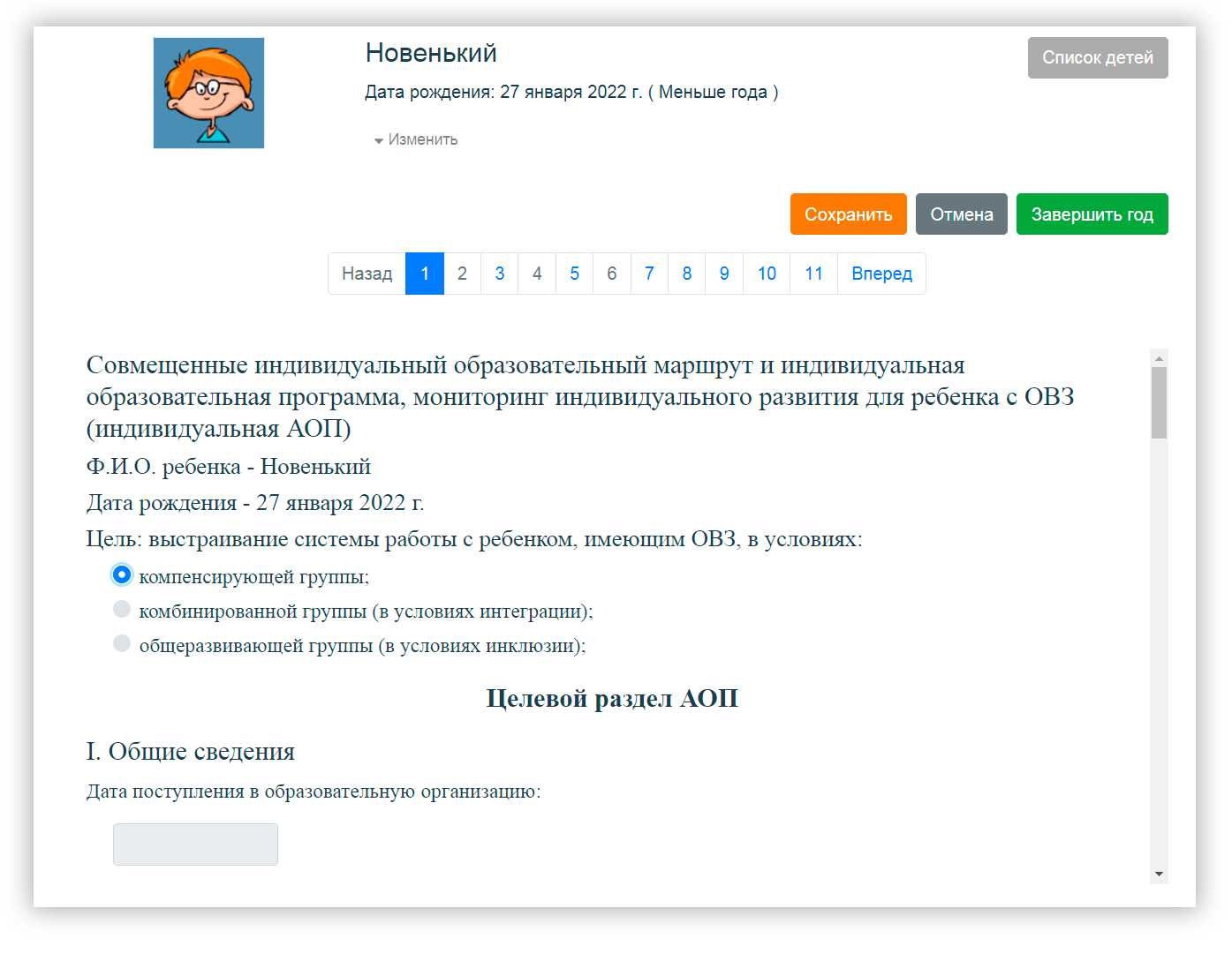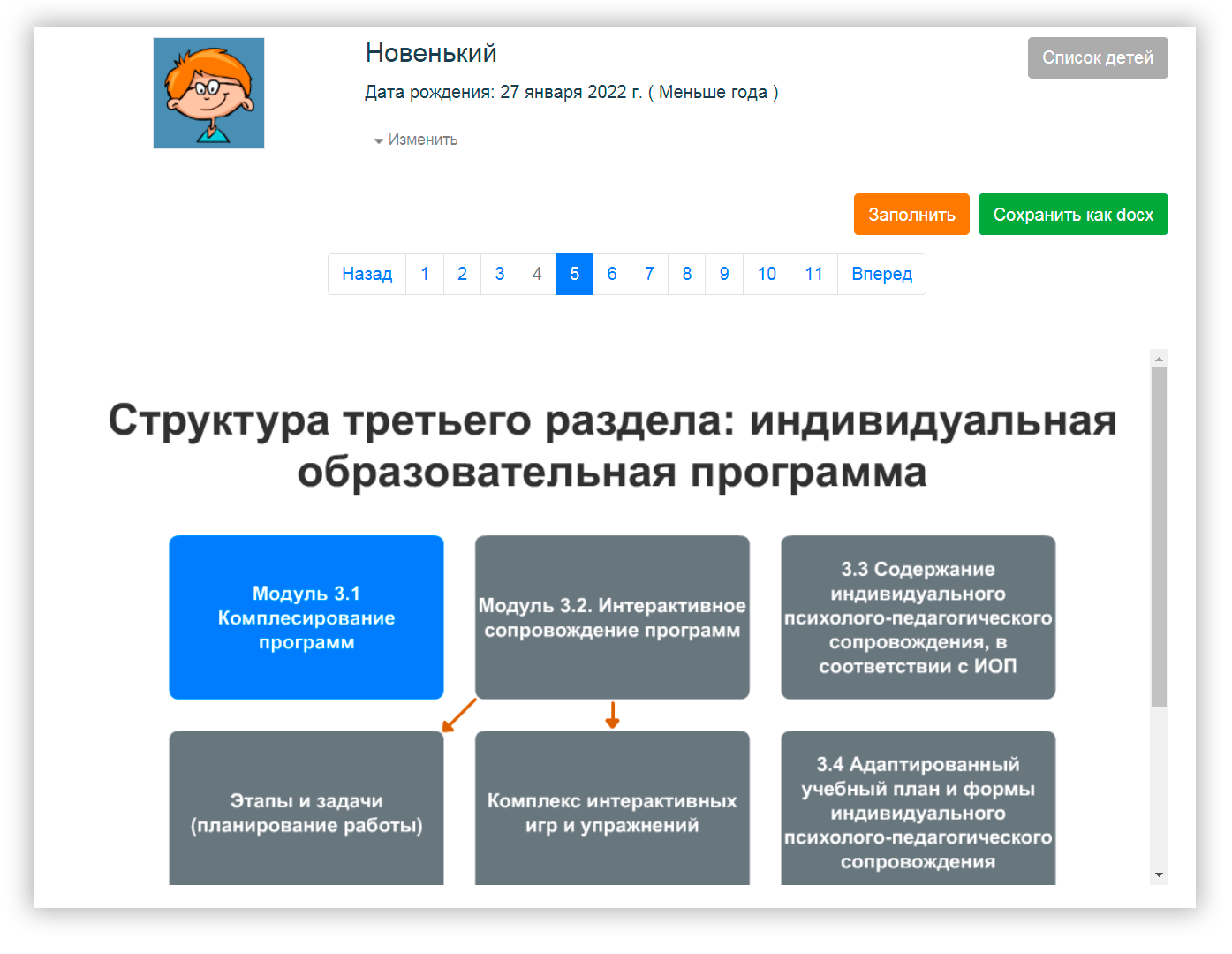 С помощью программы вы составите документ со всеми составляющими работы с дошкольником в течение года: общими сведениями, спецификой маршрута, индивидуальной образовательной программой, программой работы с семьей и мониторингом индивидуального развития.