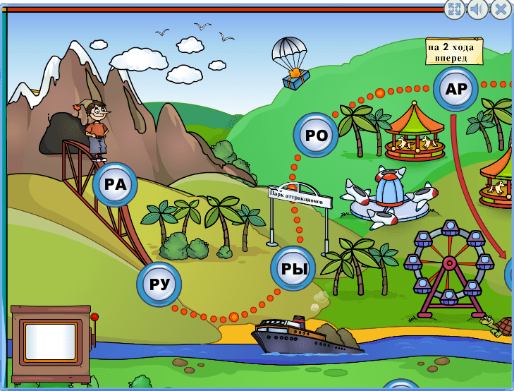 Ящик в углу экрана укажет количество ходов. Ребенок произносит слоги, по которым идет Заяц, а затем выполняет выпавшее задание.