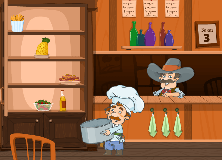Ребенок должен запомнить прозвучавший заказ и выбрать те блюда, которые заказал повар.